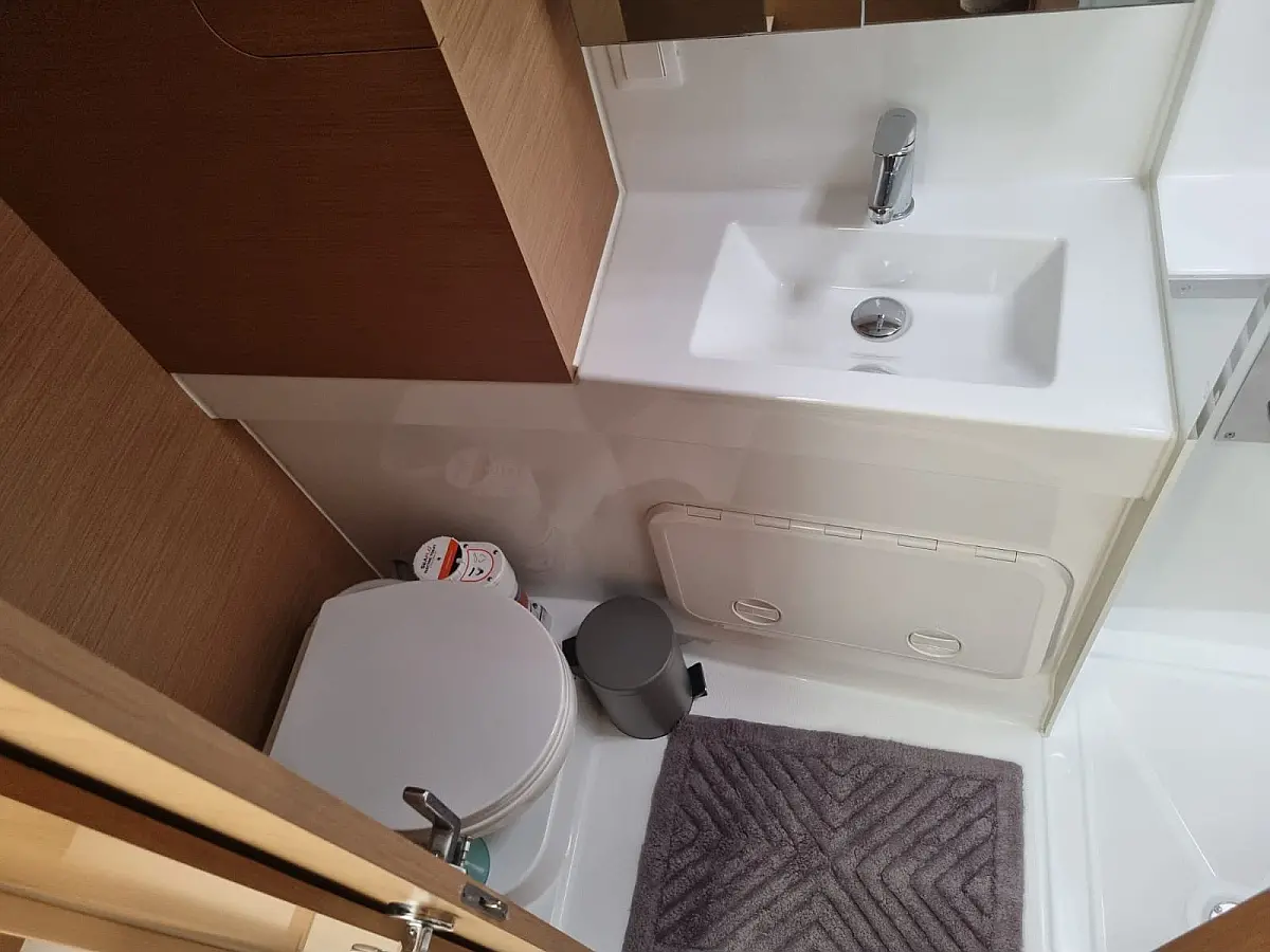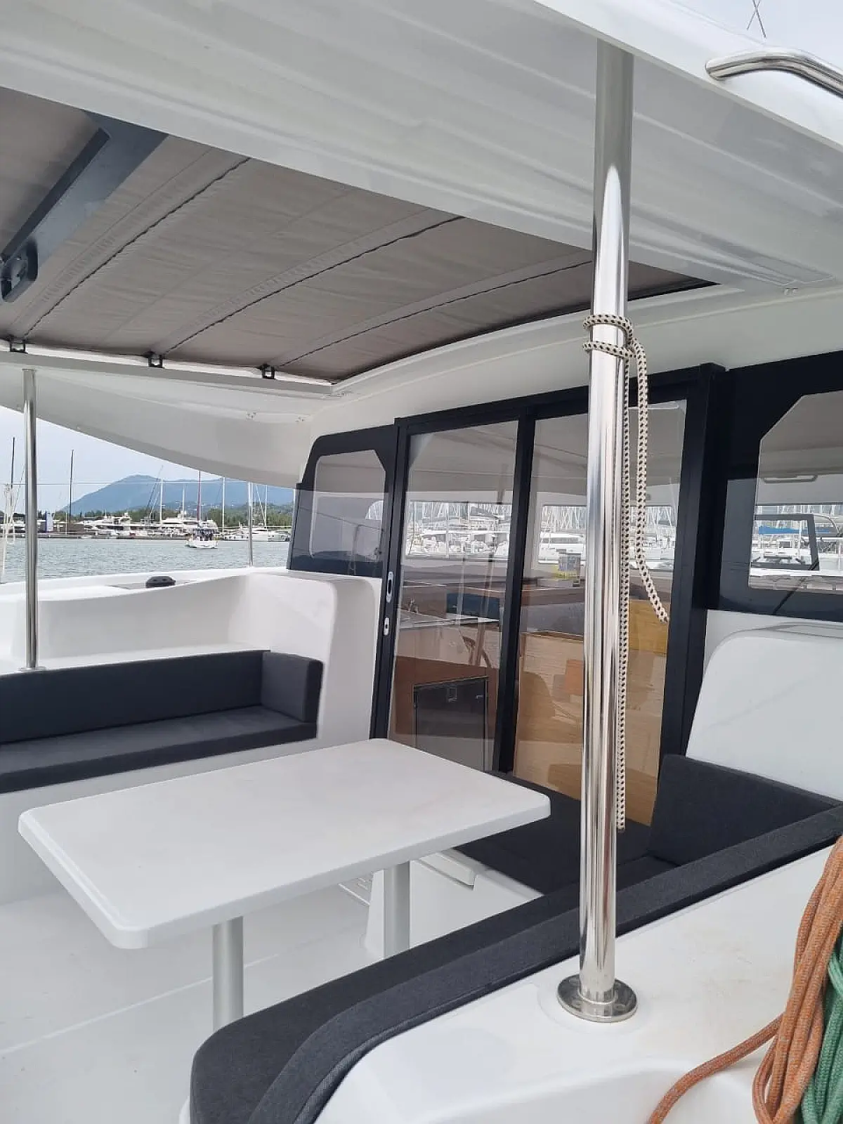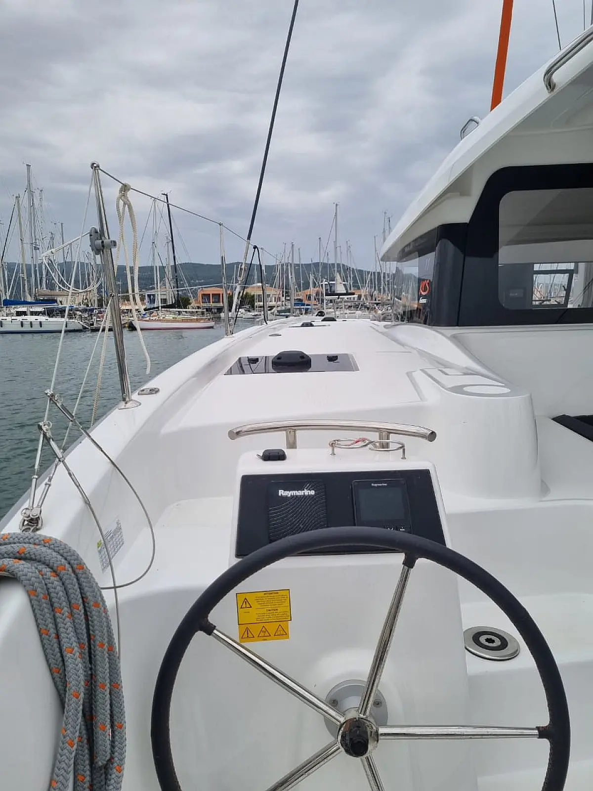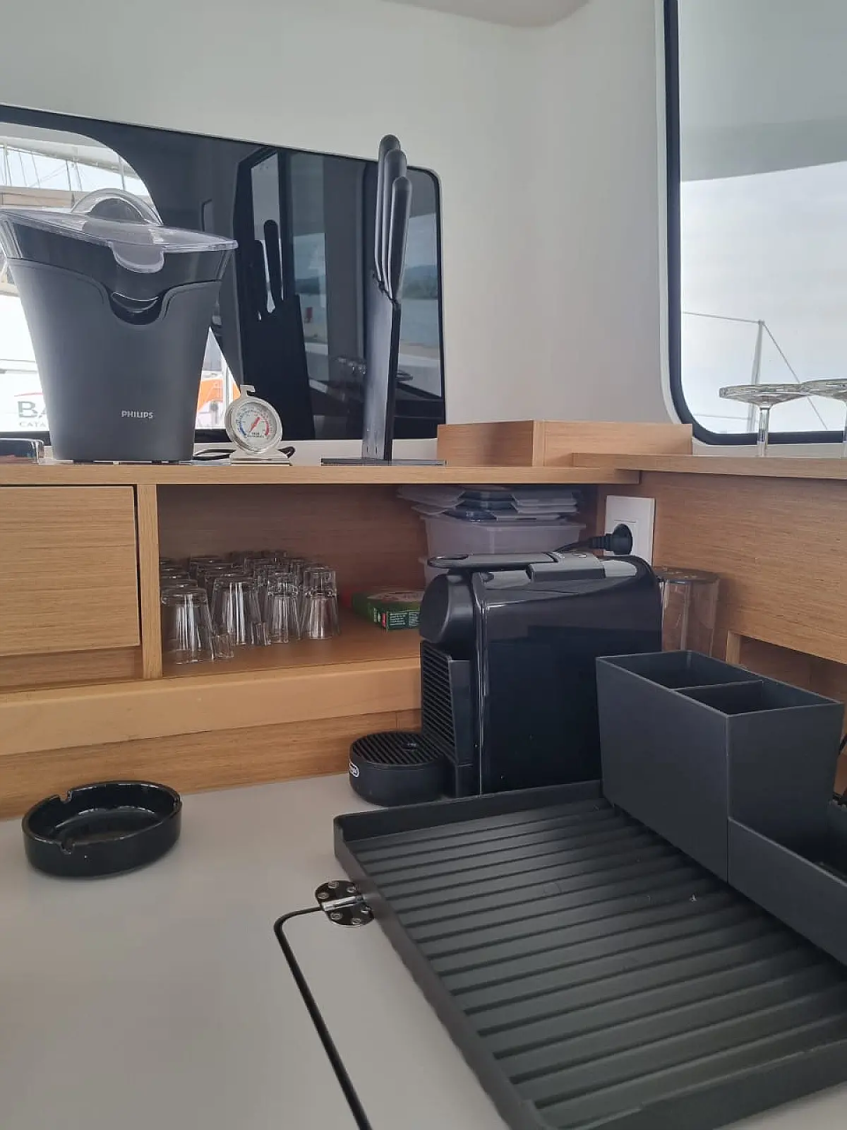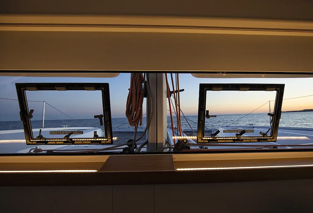Watermaker, Generator, Falownik, Klimat, Ekspres do kawy, WC elektryczne, Ponton, Kostkarka do lodu, Lodówka, Owiewka na kabinie, Bimini (daszek nad kokpitem)