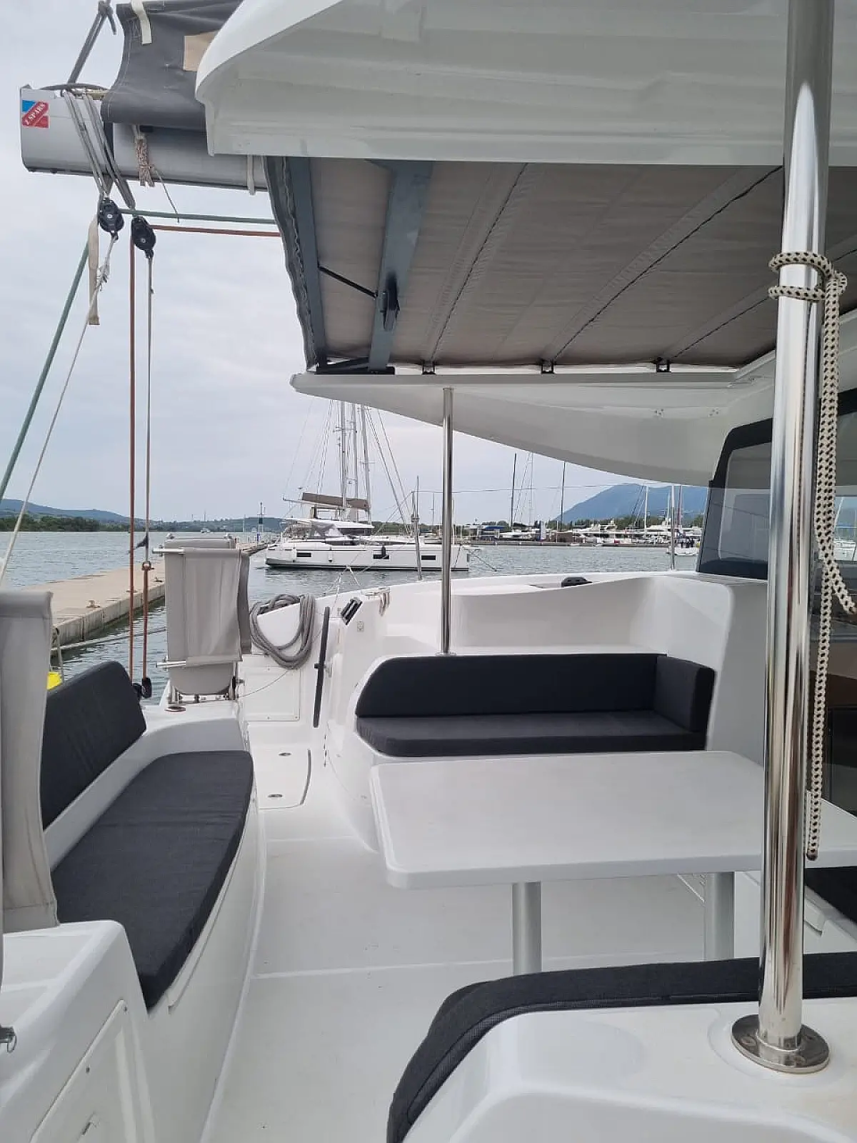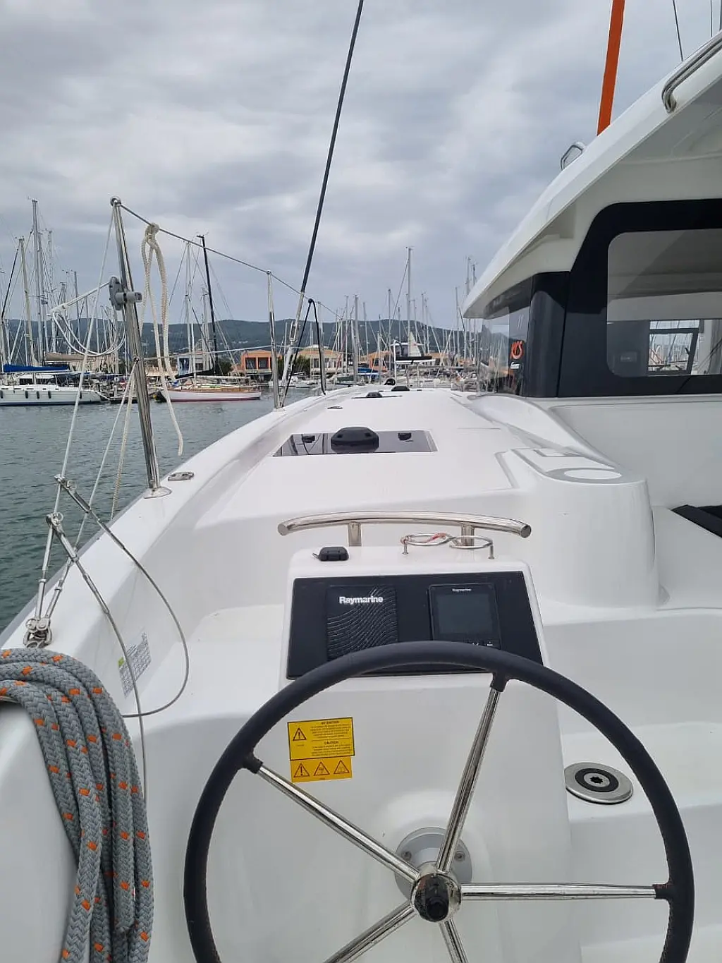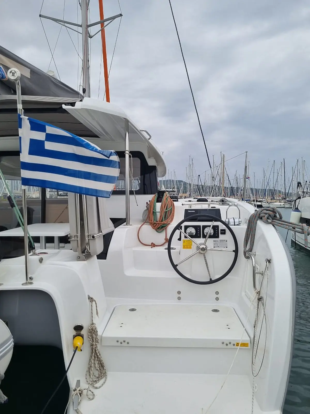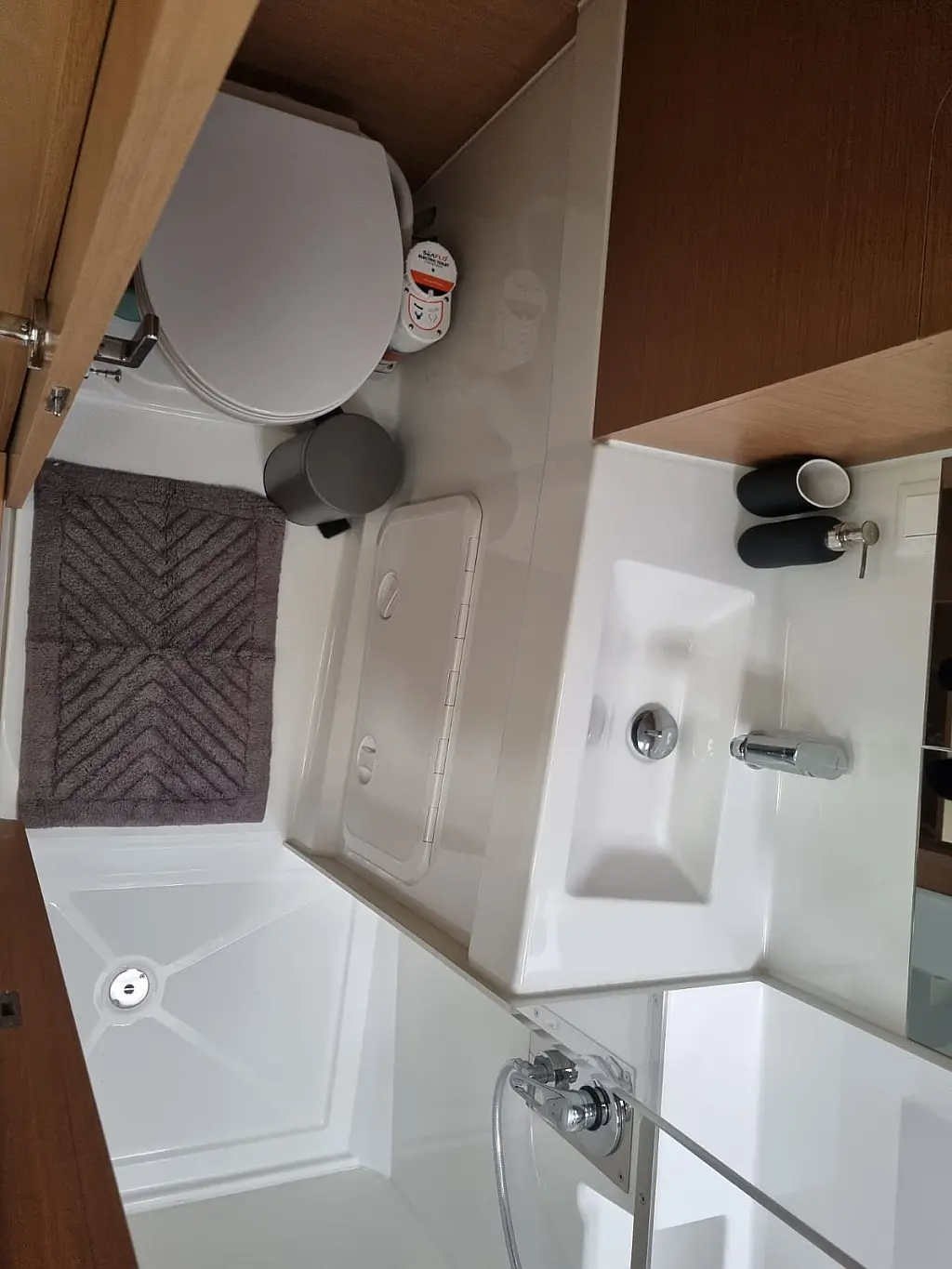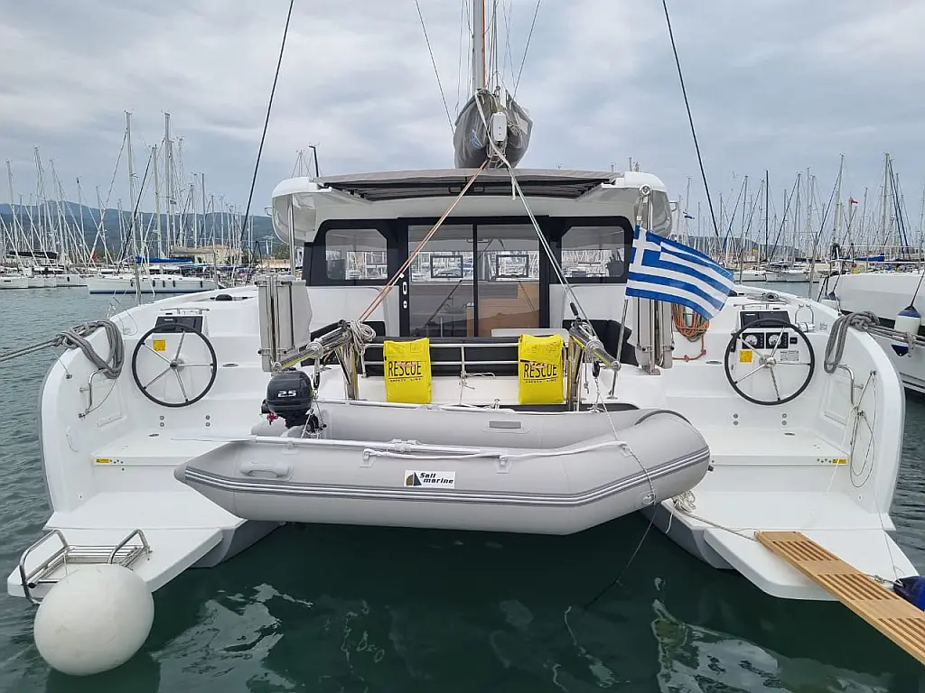 Watermaker, Generator, Falownik, Klimat, Ekspres do kawy, WC elektryczne, Ponton, Kostkarka do lodu, Lodówka, Owiewka na kabinie, Bimini (daszek nad kokpitem)