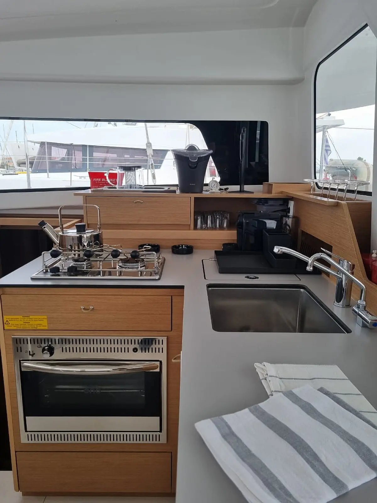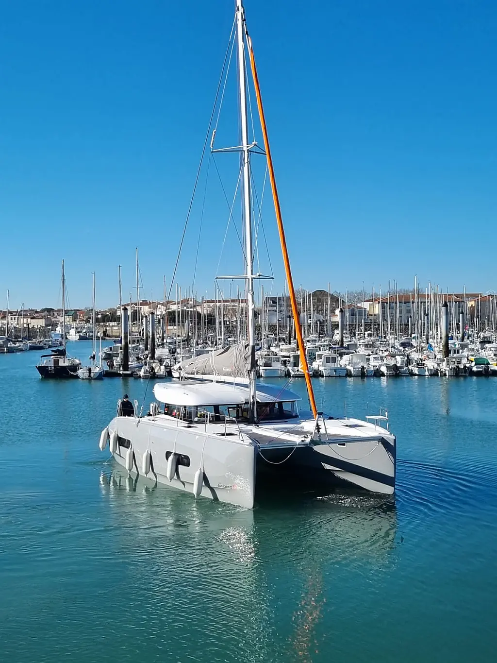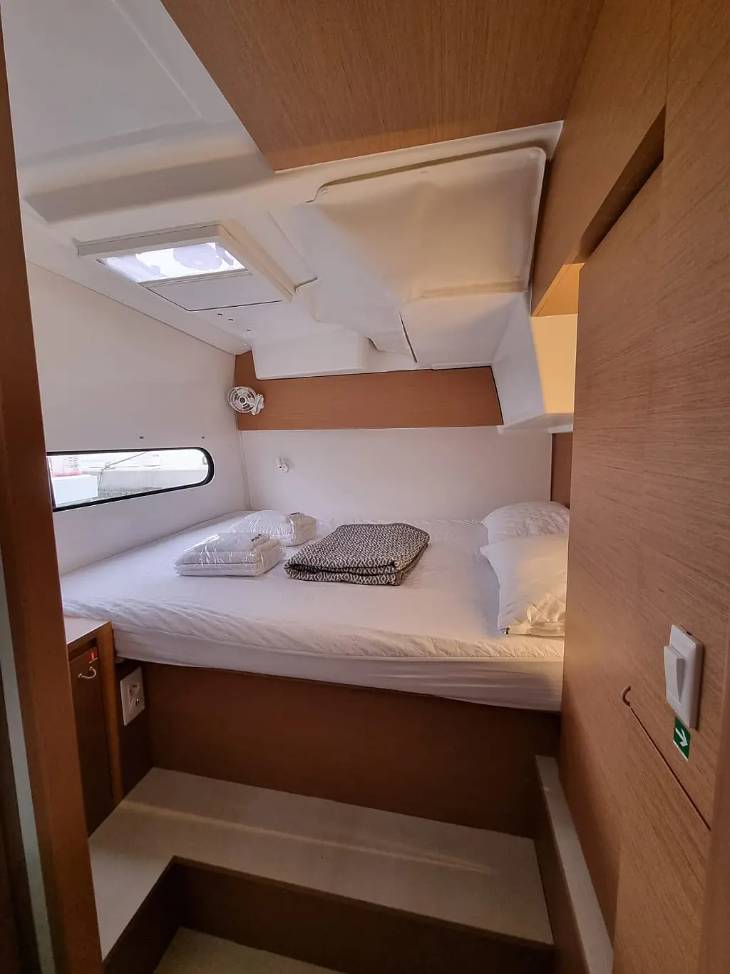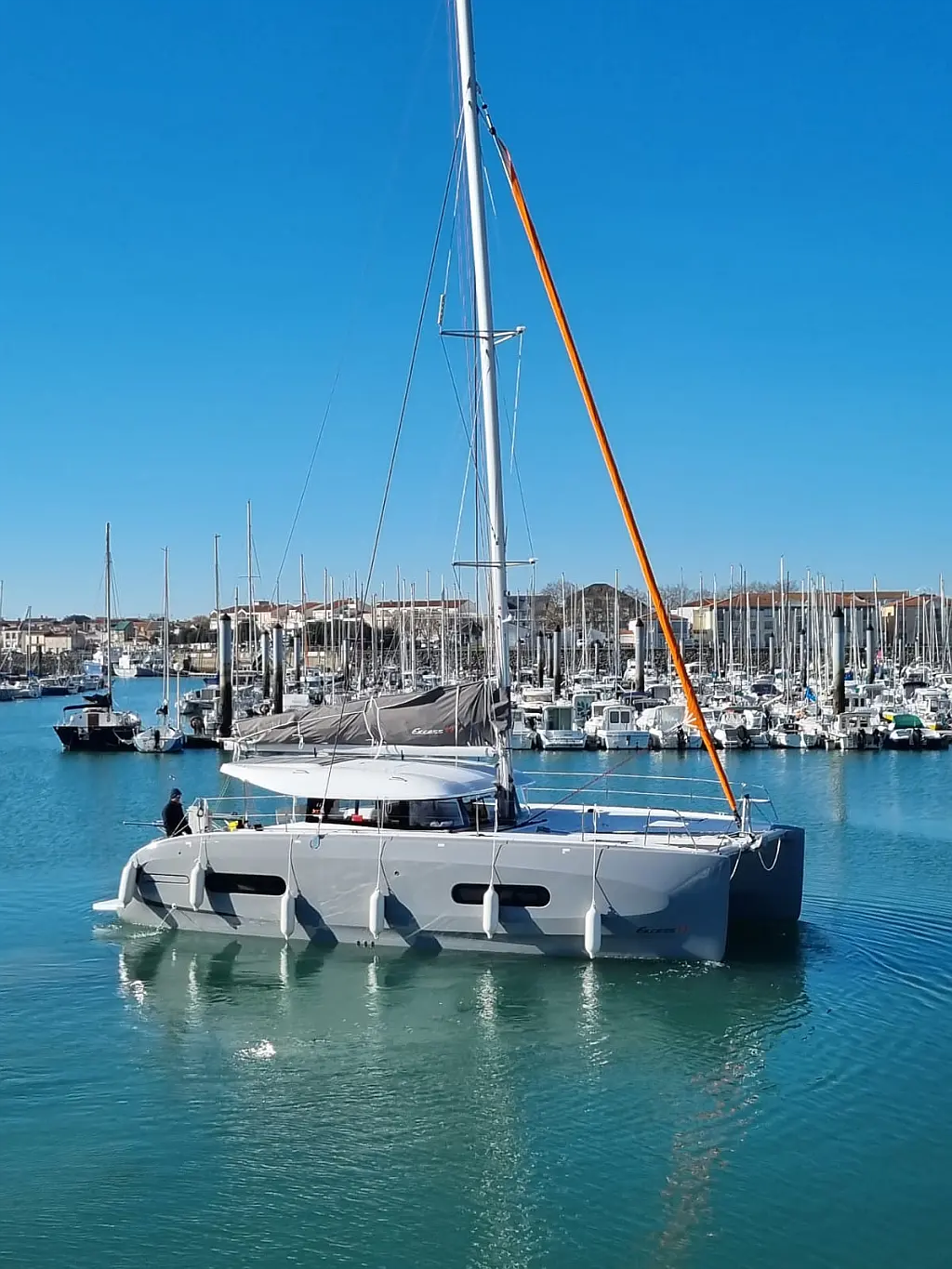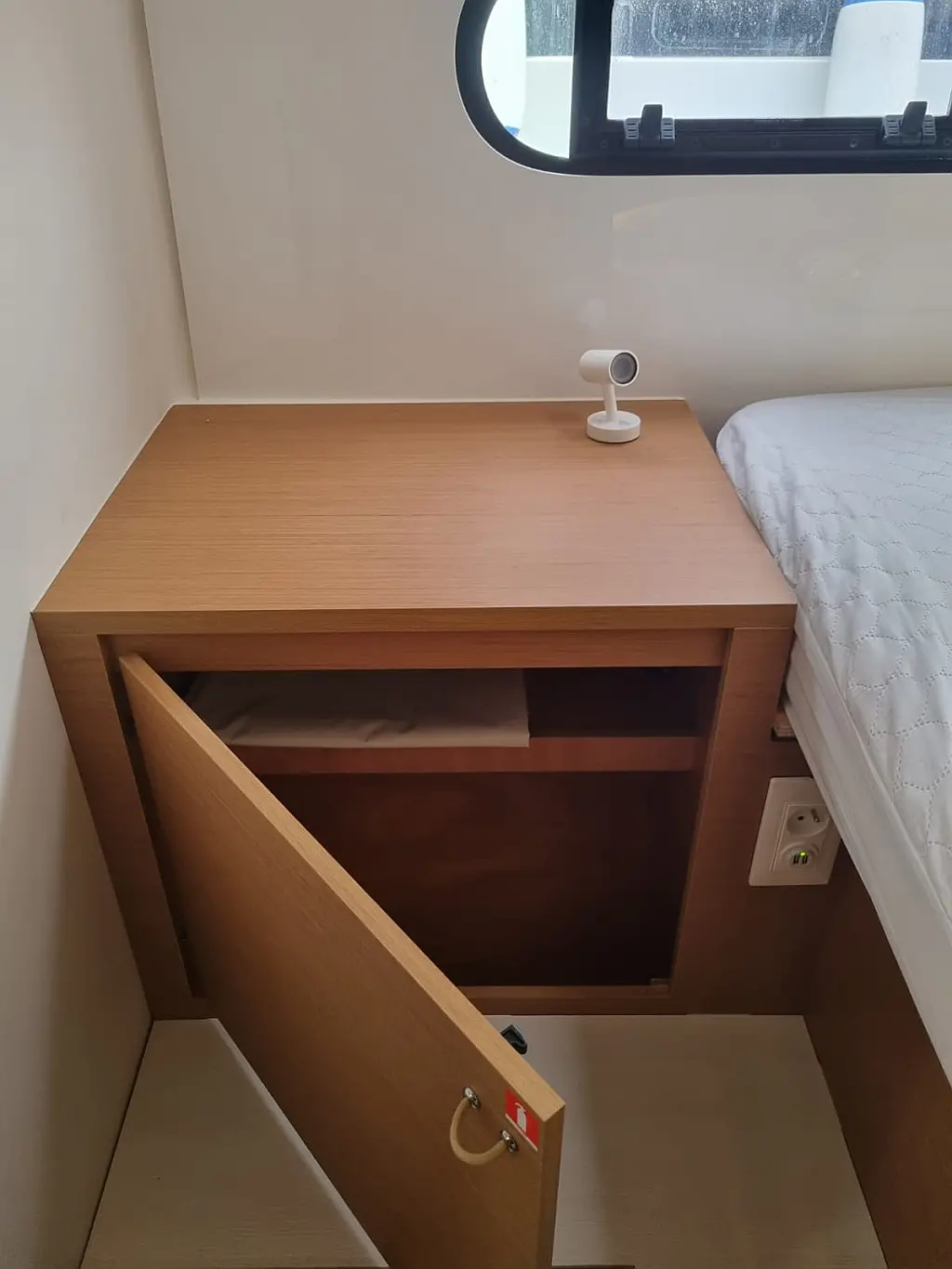 Watermaker, Generator, Falownik, Klimat, Ekspres do kawy, WC elektryczne, Ponton, Kostkarka do lodu, Lodówka, Owiewka na kabinie, Bimini (daszek nad kokpitem)