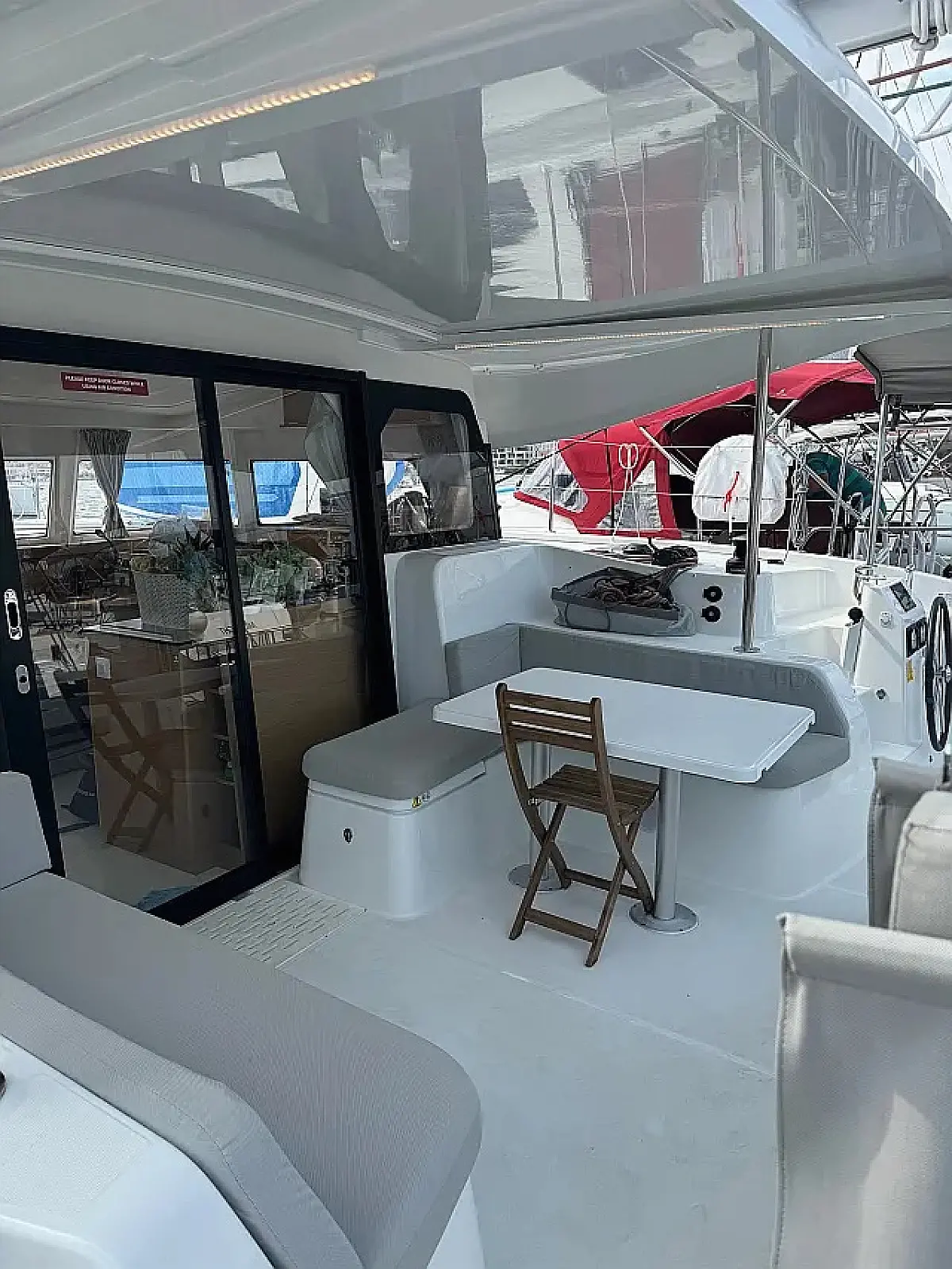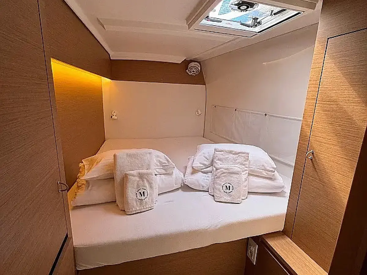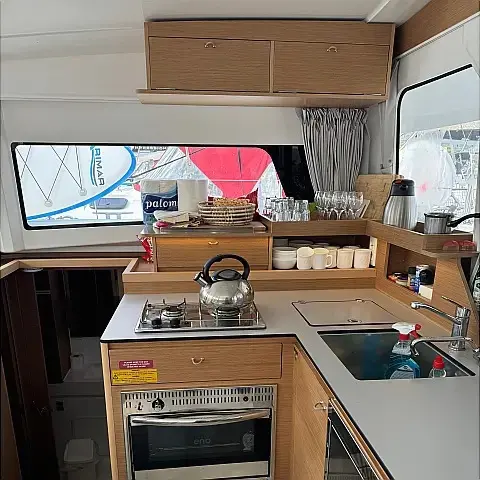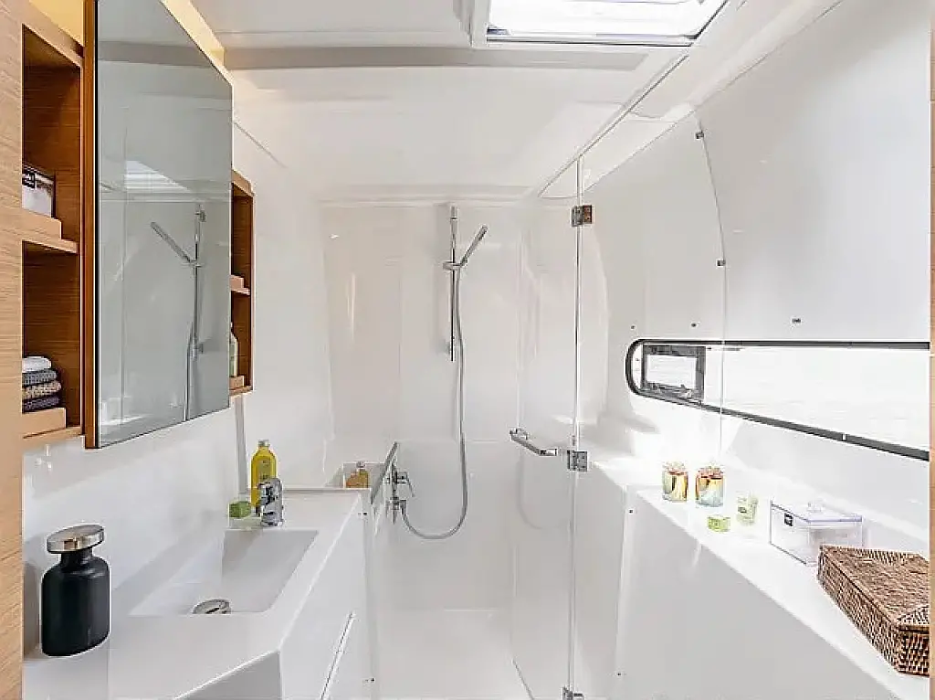 Klimat, Bimini (daszek nad kokpitem), poduszka kokpitu, Głośniki w kokpicie, Ponton, Ekspres do kawy, Lodówka, WC elektryczne, Generator, Ogrzewanie, Zbiornik nieczystości, Falownik, Silnik do pontonu, Panel Słoneczny, Wi-Fi i Internet