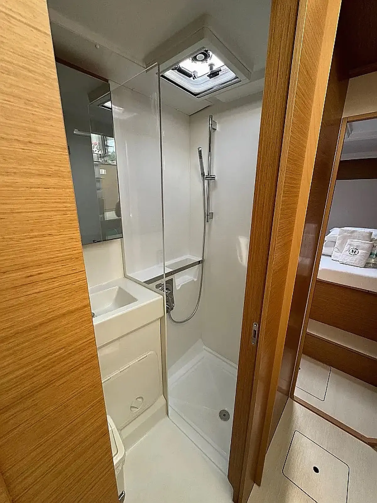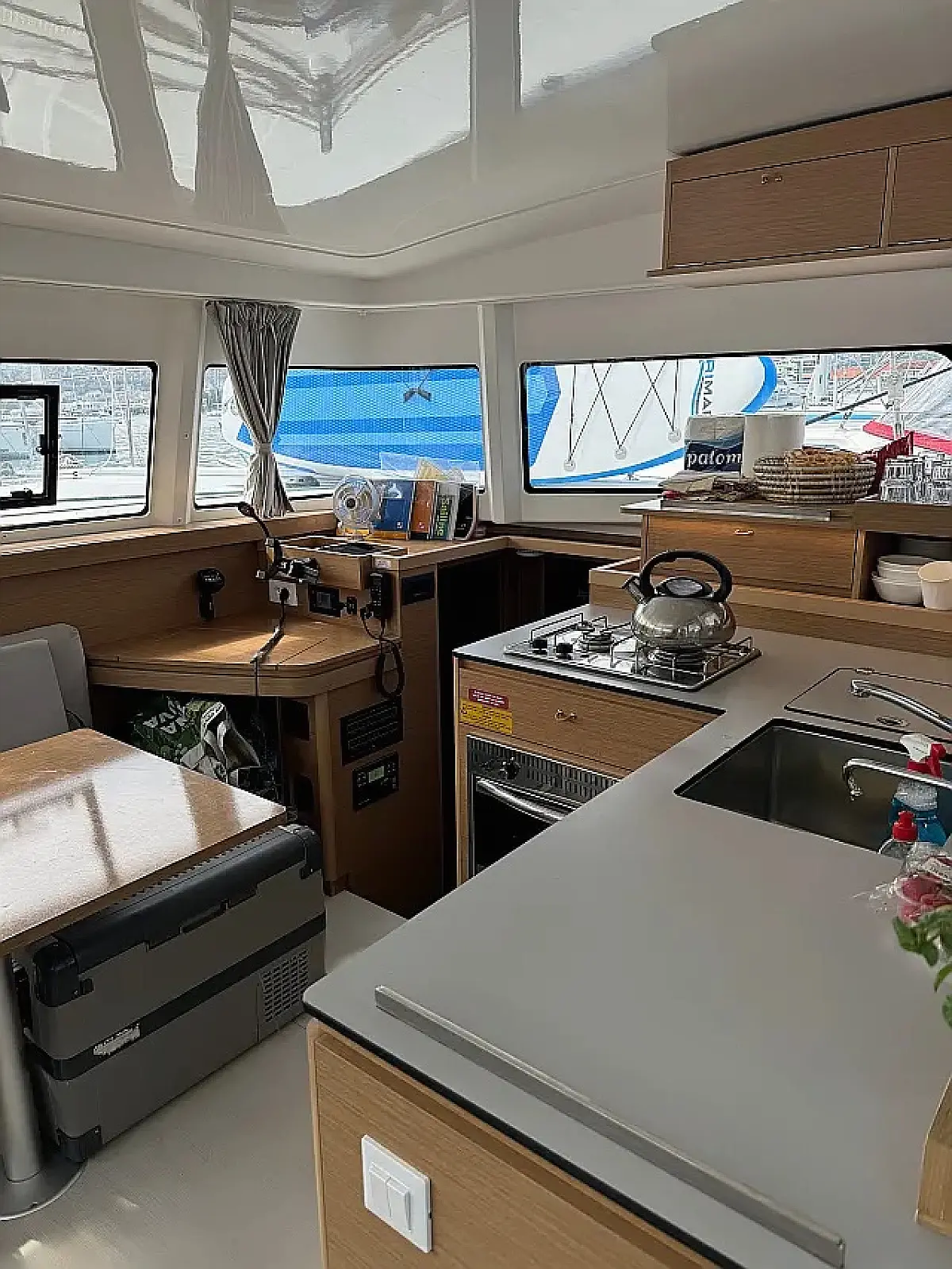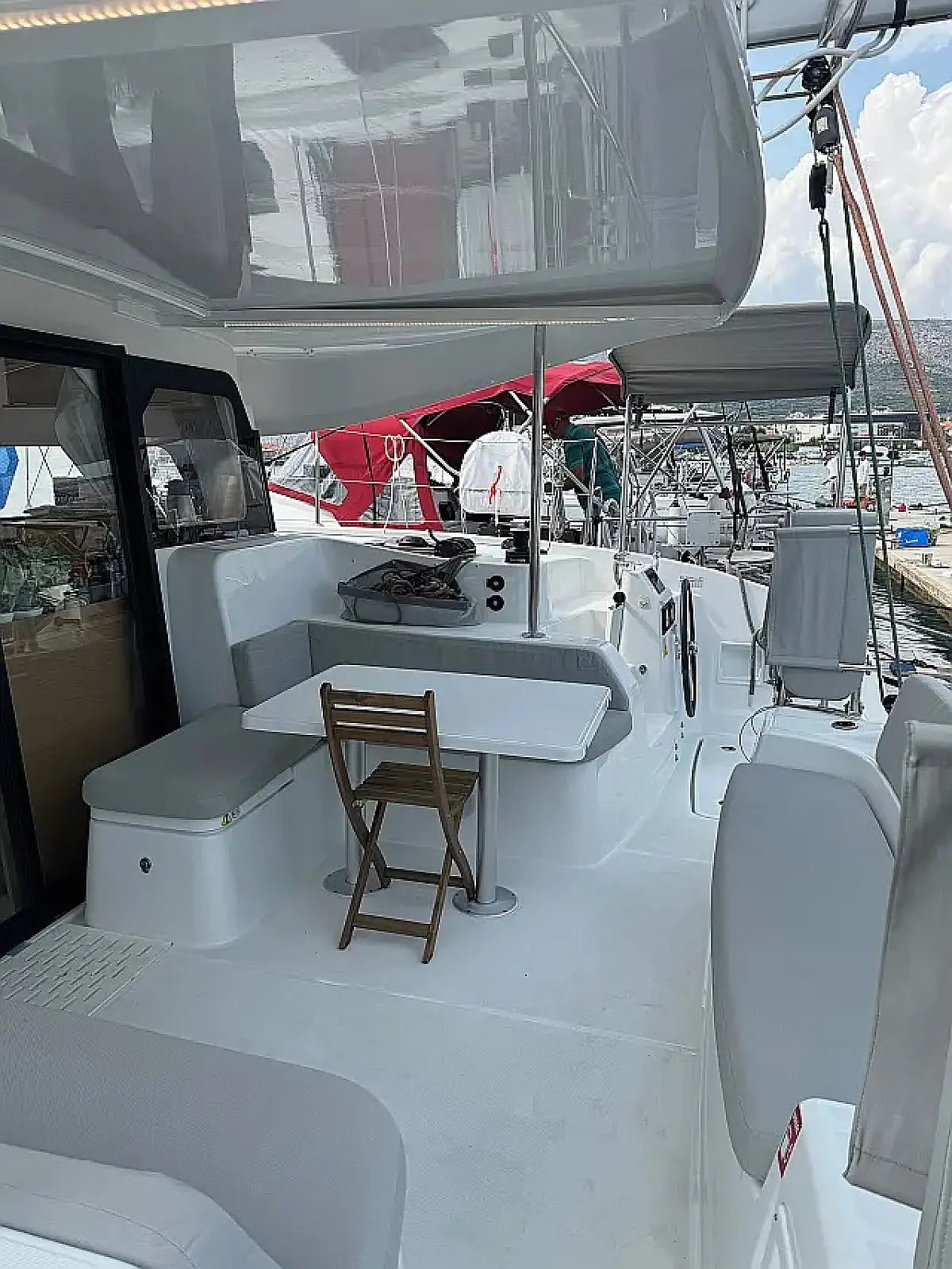 Klimat, Bimini (daszek nad kokpitem), poduszka kokpitu, Głośniki w kokpicie, Ponton, Ekspres do kawy, Lodówka, WC elektryczne, Generator, Ogrzewanie, Zbiornik nieczystości, Falownik, Silnik do pontonu, Panel Słoneczny, Wi-Fi i Internet