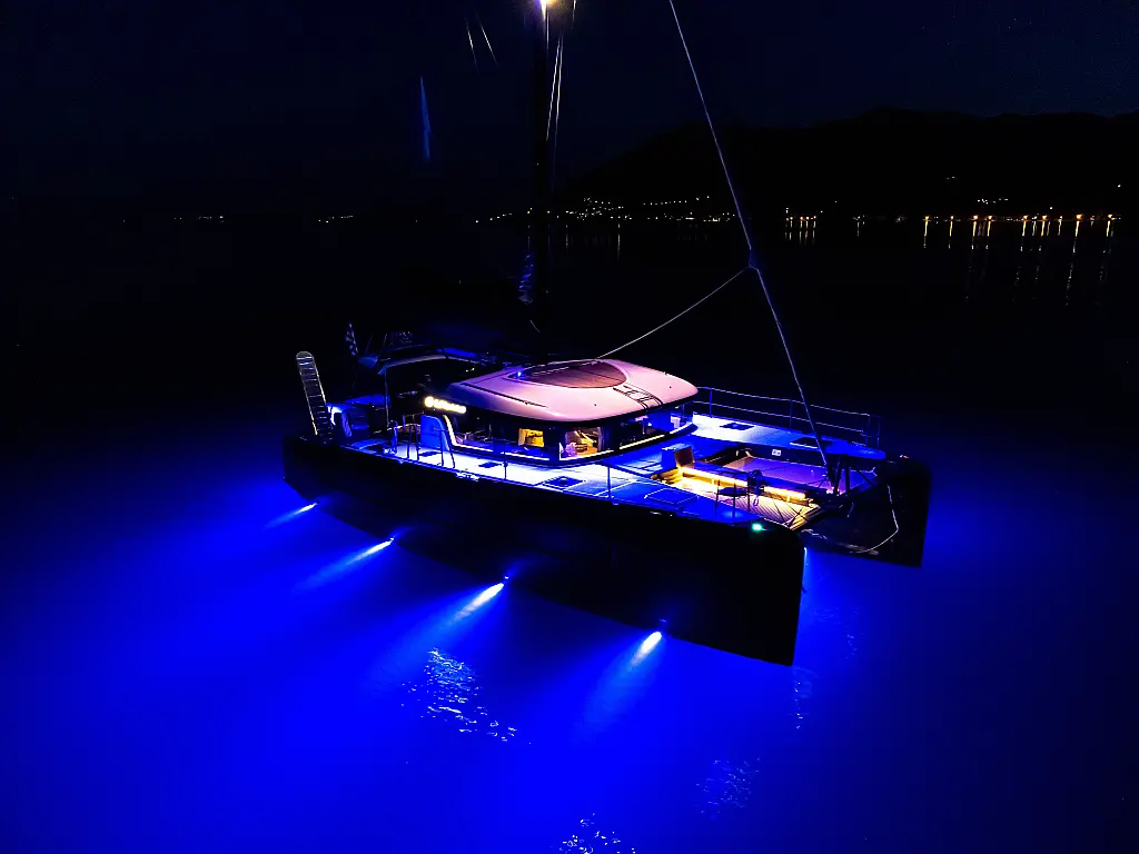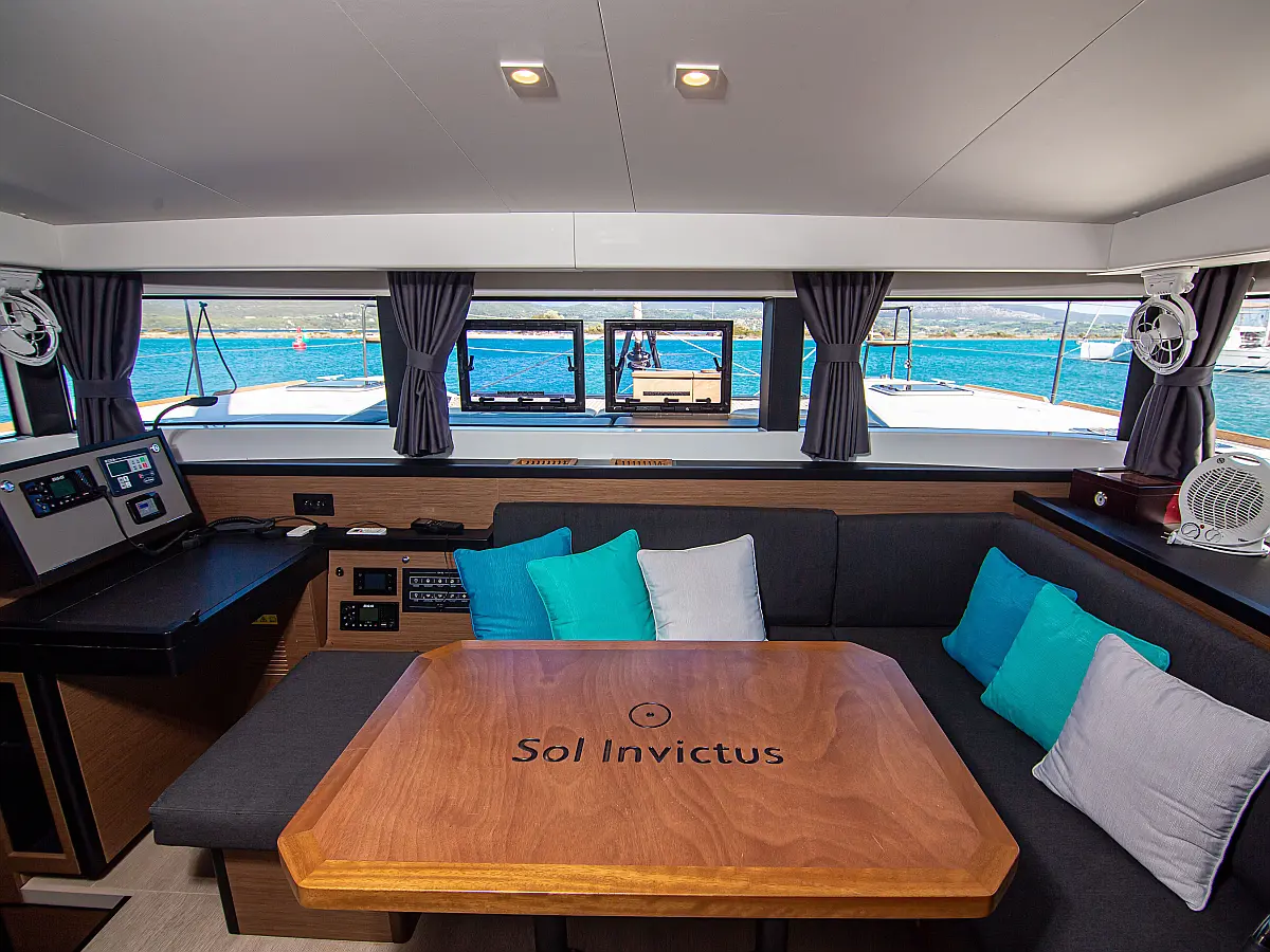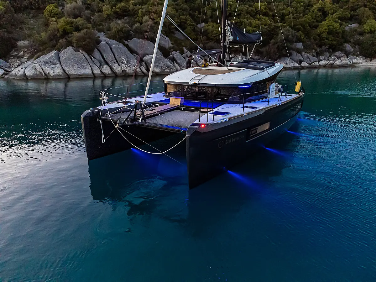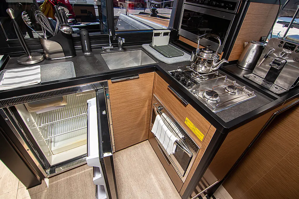 Lodówka, Klimat, Bimini (daszek nad kokpitem), poduszka kokpitu, Głośniki w kokpicie, Ponton, Ekspres do kawy, WC elektryczne, Generator, Ogrzewanie, Zbiornik nieczystości, Falownik, Silnik do pontonu, Teak Cockpit, Wi-Fi i Internet
